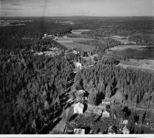 | ilmavalokuva: Nastola, muutama asuinrakennus, metsää, taustalla pilkottaa kirkko puiden takaa, peltoja |
