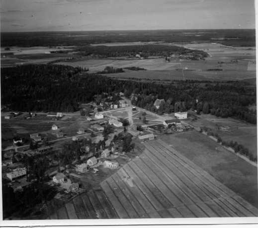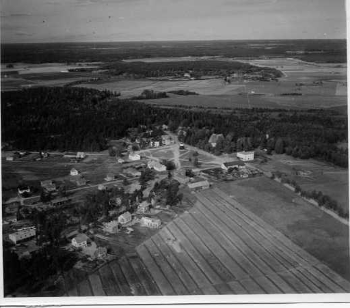 | ilmavalokuva: Elimäki, kirkonkylää, asuin- ja liikerakennuksia, kellotapuli (Aatami Marttila 1795-97), kirkko (Petter Lohman 1678) pilkottaa puiden takaa, peltoa, metsää |