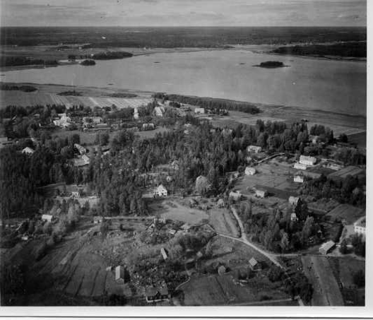 | ilmavalokuva: Lapinjärvi, asuinrakennuksia ulkorakennuksineen, metsäsaarekkeita, peltoa, järvi |