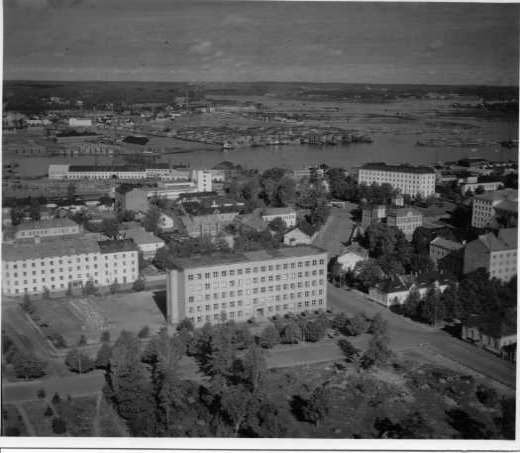 | ilmavalokuva: Kotka, kerrostaloja, satama-aluetta, taustalla tehdasalue, puutaapeleita, uitettua puuta |