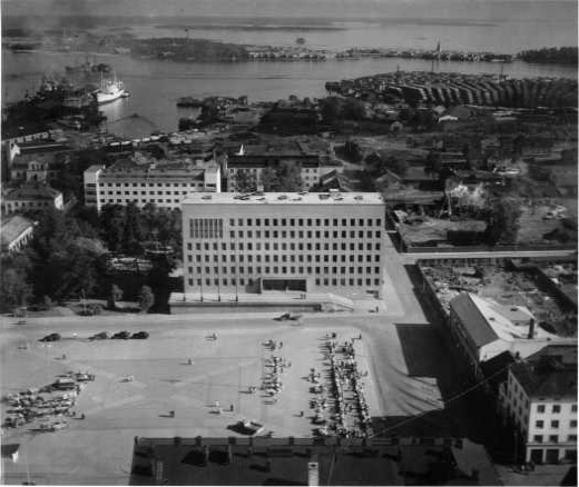 | ilmavalokuva: Kotka, etualalla aukio (tori?), korkea kerrostalo, pari matalampaa kerrostaloa, puutaloalue, taustalla satama, laiva, rautatie, valtavat määrät puutaapeleita |