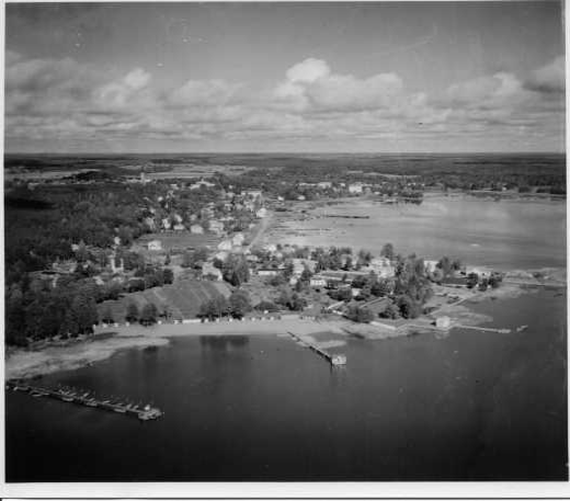 ilmavalokuva: Loviisa, Loviisanlahti, uimaranta, asuinrakennuksia, metsää, taustalla näkyy mm