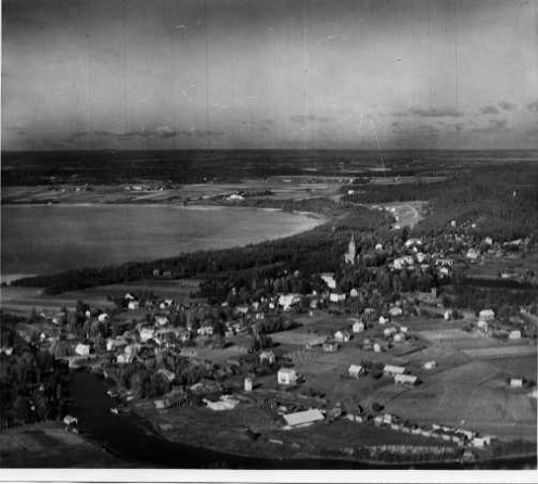 | ilmavalokuva: Pälkäne, yleisnäkymä kirkonkylään, joki, järvi |
