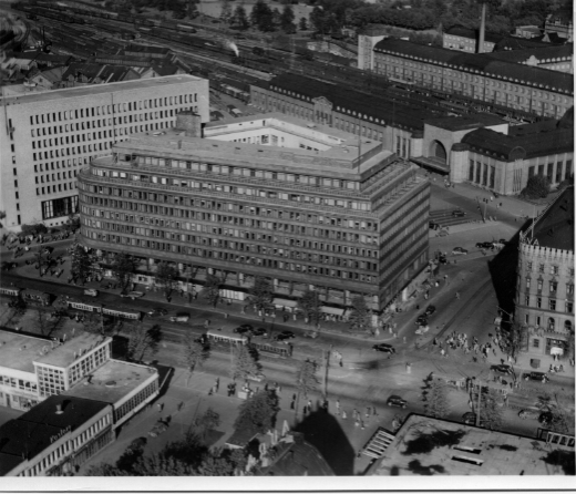 | ilmavalokuva: Helsinki, SOK:n talo, taustalla rautatieasema, vasemmalla postitalo, raitiovaunuja, autoja |