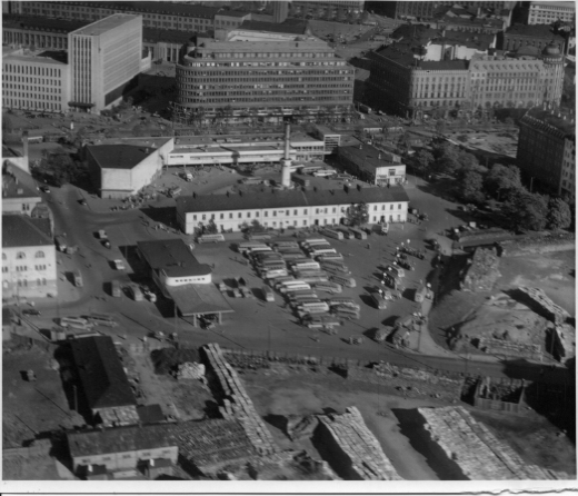 | ilmavalokuva: Helsinki, linja-autoaseman seutua, paljon linja-autoja, etualalla halkopinoja, taustalla Mannerheimintie ja mm |
