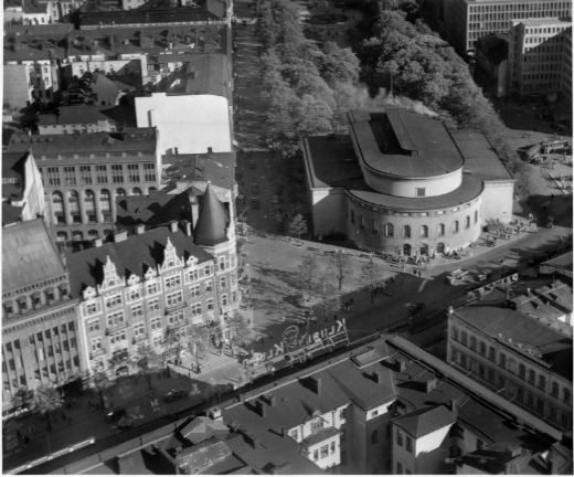 | ilmavalokuva: Helsinki, Ruotsalainen teatteri, Esplanaadien alku, kerrostaloja |