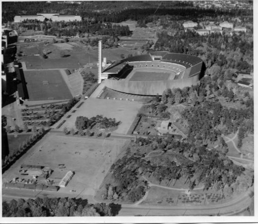 | ilmavalokuva: Helsinki, stadion, vieressä pallokentät |