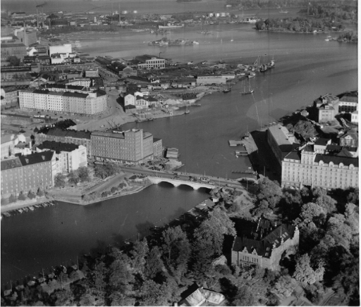 ilmavalokuva: Helsinki, Töölönlahti, Pitkäsilta, vasemmalla Hakaniemi, taustalla Sörnäisten satama, laivoja