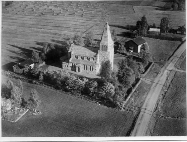 | ilmavalokuva: Kalvola, kirkko, ympärillä peltoa, yksi asuinrakennus |