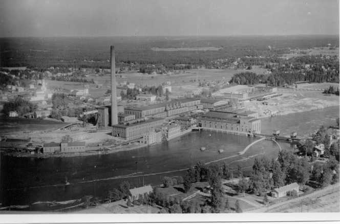| ilmavalokuva: Sippola, Myllykoski, Yhtyneet Paperitehtaat Oy, tehdasalue Kymijoen varrella, voimalaitos, uittopuomit, taustalla peltoa |