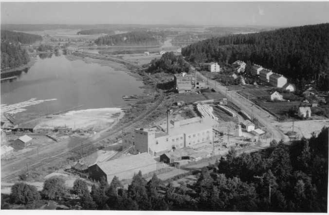 | ilmavalokuva: Hämeenlinna, Osuuskunta Metsäliitto Hämeen Tehtaat ? vaneri- ja lastulevytehtaat ? Tehtaan takana lautatarha, Oy Suomen Turkistehdas, kerrostaloja, peltoja, metsää |