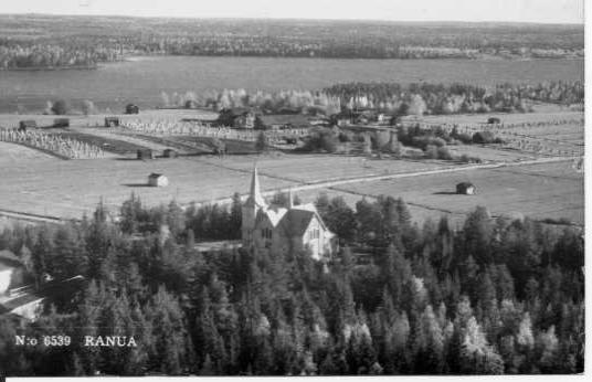 Edessä Ranuan kirkko, kirkon takana Erkkilän pihapiiri ja järven takana Leppäranta.