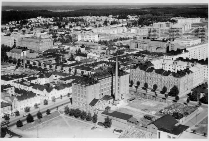 Attilan kenkätehdas kuvattuna Lounaasta. Kuvan vasemmasta alanurkasta kulkee nykyinen Itsenäisyydenkatu ja siihen poikittain (Attilan takana) nkyinen Yliopistonkatu/Tammelan Puistokatu. Taustalla Tammelaa.
