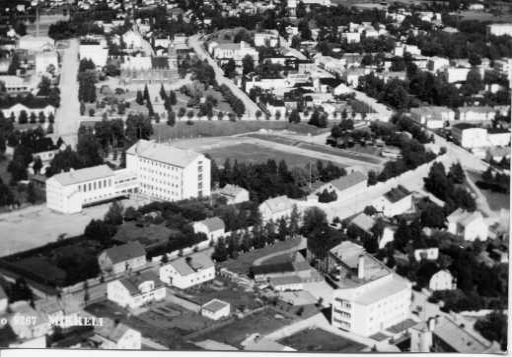 Kuvan keskellä Urheilupuisto kuvattuna etelästä. Sen vasemmalla puolella näkyvä kookas rakennus on Mikkelin Tyttölyseo eli nk. Tipula. Tipulan takana näkyy Ristimäki, jonka keskellä sijaitseva Tuomiokirkko erottuu yllättävän huonosti.