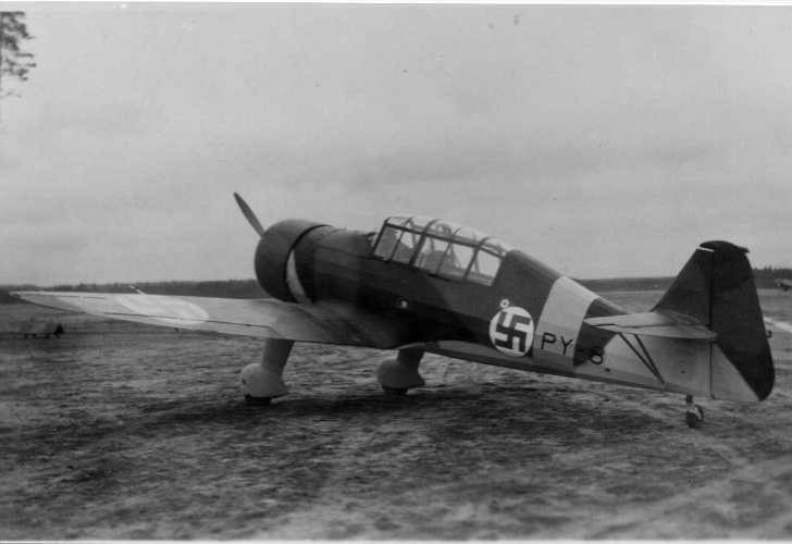 Kotimainen harjoitushävittäjä VL Pyry, tunnuksiltaan PY-8 on kuvattu jatkosodan aikana, vuosien 1941-44 välillä. Tämä käy ilmi takarunkoon maalatusta, väriltään keltaisesta itärintamatunnuksesta, joka näkyy vaaleana nauhana PY-kirjainten kohdalla.