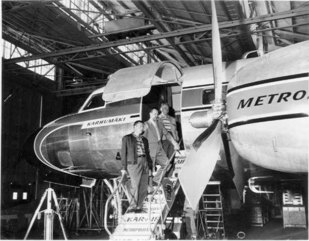Kar-Airin tekniikan edustajat vastaanottamassa Metropolitan matkustajakonetta Convairin tehtaalla San Diegossa vuonna 1957. portailla lentokonemekaanikko Stan Kalpa (edessä) sitten dip.ins. Tuomas Karhumäki ja ylimpänä tarkastaja Pertti Levola(lähde: Ismo Tervonen KAR-AIR Tilauslentoliikenteen edelläkävijä 1957-1980)