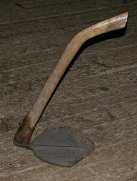 Puuta ja rautaa. Soikea paksuhkosta puusta tehty varsi, joka tekee yläpäässä mutkan. Teräosa on kiinni varren alapuolella isolla ruuvilla ja rautavanteella. Terä on litteä lapamainen. Varren tukevuutta on lisätty lyömällä puukiiloja varren ja terän väliin.