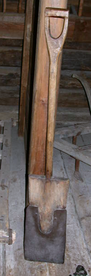 Puuta ja rautaa. Lapion varsi ja kantaosa pesää sekä kahva ovat yhdestä puusta. Terää reunustaa tupen tavoin rautainen reuna, joka on kiinni kahdella rautanaulalla.
