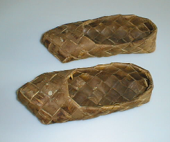 N 2,6 cm levyisestaä tuohiliuskasta punotut jalkineet. Kärki suippo ja hiukan ylöspäin kaartuva. Melko käyttämättömät, sillä pohja vain vähän kulunut.