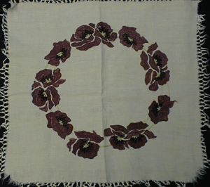 pieni neliön muotoinen liina, johon varsipistoin kirjottu suuria punaisia anemoneja. Reunoissa kuluneet hapsut