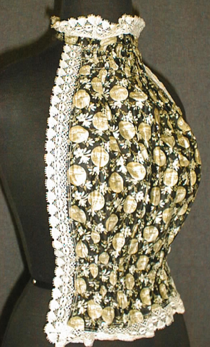 naisen puvun etumus, joka kiinnittyy kaulan ympäri taakse hakasen avulla. Etumus on tehty painokankaasta, johon on kuvattu pieniä pyöreitä maisemavalokuvia. Etumus on poimutettu ylä-ja alaosasta, reunoihin on ommeltu tehdastekoinen pitsi, myös pääntiellä pitsisomistus.