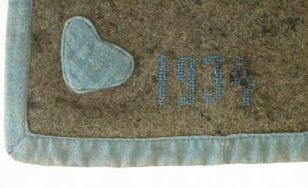 Villaa. Harmaa vanutettu villakangas. Kantattu siniturkoosilla ohuella kankaalla, lev. 2-3 cm, samaa kangasta sydämet nurkissa. Sinisellä ristipistoin n. 5 cm korkuiset kirjaimet EH sekä vuosiluku 1934. Kiinnittiminä 2 lyhyttä nahkaremmiä ja soljet.