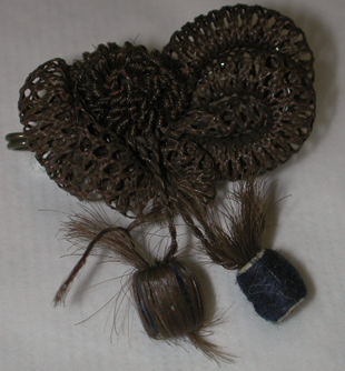 Rintaneula. Koru on tehty ohuesta rautalangasta ja ruskeista hiuksista. Hiukset muodostavat mutkittelevan putken, kikan ja kaksi lyhyen letin päässä pampulaa.