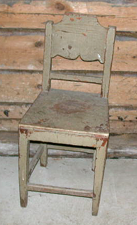 Puuta, maalattu harmaan vihertävällä maalilla, pohjaväri punaruskea. Istuinlauta yhdestä puusta, naulattu puunauloilla. Sarja suora. Hartialaudan ylä- ja alareuna profiloitu. Jalat suorat, jalkainkehä umpinainen (kulkee kaikkien jalkojen kautta), pienet samalla korkeudella.
