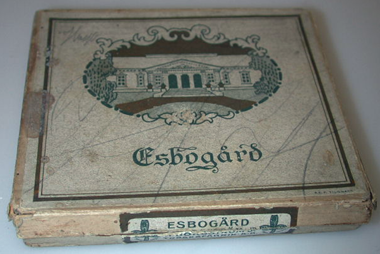 Pahvinen rasia. Lienee ollut valkoinen, nyt likaisen harmaa. Kannessa etiketti, jossa medaljongin sisällä kartanon kuva, ja teksti Esbogård sekä kaksi vaaleanruskeaa etikettiä kiertävää reunaviivaa. Rasia ollut suljettu sinetillä (paperia), jossa teksti ESBOGÅRD H. BORGSTRÖM JR. Tobaksfabrik .A.B. ja kaksi lehdykkä koristetta ja teksti priv. 1834. Sivulla paperisinetti, jossa teksti: Savukkeita. Cigaretter pr. 1,000 kpl. st. Smk. 90:- 120:- Fmk.