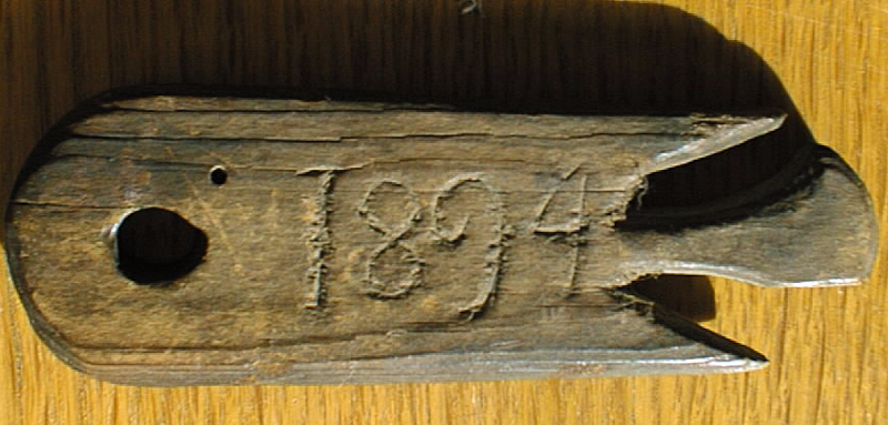 Tyylitellyn kalan muotoinen. Vuosiluku 1894 kaiverrettu. Pyrstön toinen kulma lohjennut.