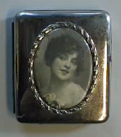 Suorakaitio rasia, jossa kääntyvä kansi. Kannessa soikea aukko, jossa mv-valokuva naisesta. Sisus kullanvärinen, kuminauhat kummassakin puoliskossa.