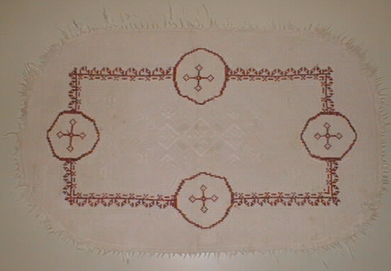Valkoinen ellipsin muotoinen pellavaliina, jonka keskustaan kudottu vinoruutuja ja korinpohjaa muistuttavaa sidosta ja keskustan nurkkiin kudottu pienet tähtikuviot. Keskusta rajattu suorakaiteen muotoiseksi 2 cm leveällä panamasidoskuviolla (nauhamainen), keskustan suorakaiteen koko 32 cm x 17 cm. Edelliset kuviot kudottuja, liinan pohjaväriä, valkoista. Panamasidoksinen suorakaiteen reunus kirjottu myös punaisella langalla ristipistoin, samoin kuin reunuksen kuusikulmaiset panamasidoksiset kuviot, joiden reunat reunustettu ristipistoin. Kuusikulmioiden halkaisija 9 cm. Kuusikulmioita on yksi suorakaiteen jokaisen sivunkeskivälissä. Kuusikulmioiden keskellä myös punaisella langalla kirjotut ristikuviot. Liinan ulkoreuna raesidosta.