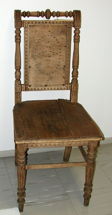 Tuoli, jossa on sekä uusklassistisia että uusrenesanssin piireteitä. Etujalat ovat sorvatut ja niissä on klassismille ja kustavilaisuudelle tyypillisiä kannelyyrejä eli pystysuoria uria ja yläpäässä neliömäinen kenttä. Vanerisen istuinlevyn päälle on naulattu uudempi istuinlevy puusta. Edessä ja sivuilla on alasarjat. Sivutolpat ovat sorvatut, myös niissä on kannelyyrejä, neliömäisiä koristeita ja kolme pystysuoraa koristeuraa vierekkäin. Sivutolpat päättyvät pyöröliitokseen, johon on kiinnitetty vaakasuora lankarullasorvattu koristeosa. Sivutolppien keskellä on vanerilevy, jossa on pieniä reikiä. Vaneria kiertävät kehykset, jotka on koristeveistetty.