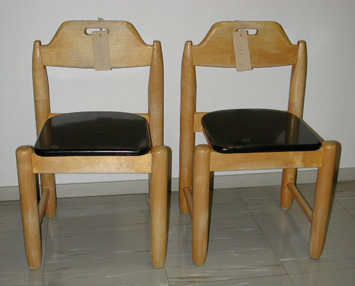 Lasten tuolin jalat koostuvat neljästä koivusta sorvatusta tolpasta. Takajalat jatkuvat selkänojan sivutolppina ja kapenevat suippomaiseksi yläpäästään. Jalkojen välissä istuimen alapuolella on sarjat. Kummallakin sivuilla on alhaalla sorvatut sarjat. Hartialauta on ylälaidastaan muotoiltu ja sen keskellä on soikea reikä. Kaikki edellä mainitut osat ovat lakattua koivua. Mustaksi maalattu istuinlevy on ruuvattu sarjoihin kiinni.