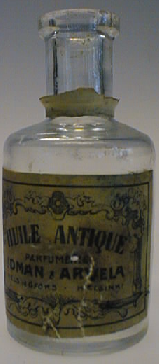 Pieni, pyöreä, väritön pullo. Hartia pyöristyy päältä tasaiseksi. Kaula kapea ja pyöreä. Suureunassa rengas, päältä suora, renkaan alla liimalapusta rengas. Sisällä korkin pala. Pohjassa rengas, keskeltä kovera. Kyljessä suorakaide, ruskehtava liimalappu: HUILE ANTIQUE, PARFUMERIE, IDMAN and ARVELA, HELSINGFORS - HELSINKI.
