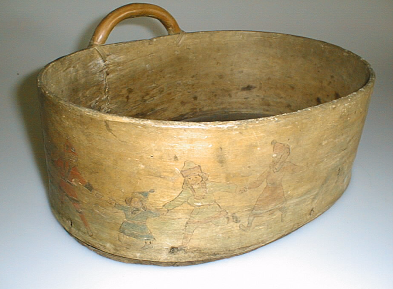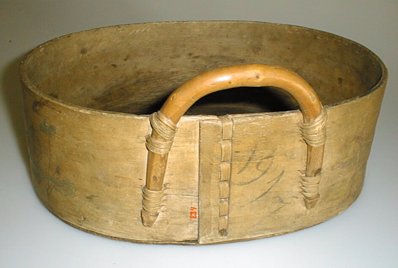 Puuta. Laidat ommeltu puunjuurella kiinni. Soikean muotoiseen puupohjaan on laidat kiinnitetty puunauloin. Vakassa on toisella sivulla (ompeleen puolella) puusta taivutettu kädensija, joka on ommeltu juurella laitaan kiinni. Kädensija on hyvin matala, ulkonee laidasta n.4 cm. Koristelu: Laidalle piirretty ja väritetty piirileikkiä tanssivia mies-ja naishahmoja. Kasvinlehtiä. Värit punainen ja vihreä. Kädensijan vieressä vuosiluku 1917, mustalla piirretty.