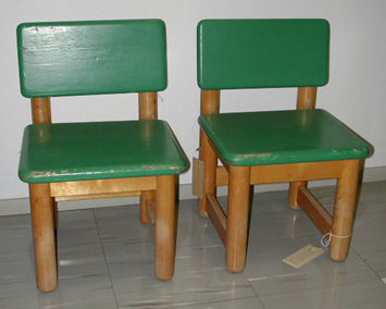 Lasten tuolin jalat koostuvat neljästä koivusta sorvatusta tolpasta. Takajalat jatkuvat sivutolppina. Jalkojen välissä on sarjat, takasarjaa ei ole. Kummallakin sivuilla on alhaalla sarjat. Takana on sarja hieman ylempänä. Kaikki edellä mainitut osat ovat lakattua koivua. Istuin- ja selkänoja ovat vihreäksi maalattua koivua. Paksujen koivulevyjen kulmat ovat pyöristetty.