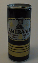 Sylinterin muotoinen tölkki, jonka sivut sini-kulta- painatteiset. Etiketissä meriupseerin kuva, tekstit: AMIRAALI EXPORT A BEER OLUT IV ÖL, Oscar voin Kraemer 1829-1904