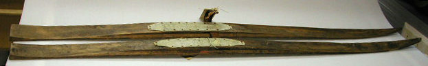 Ruskeat, tervatut, koivusta valmistetut sukset. Sukset ovat tasalevyiset, jotka kapenevat suksen kärkeen. Suksen pohjassa on matala ura, joka alkaa n. 36 cm päästä kärjestä ja jatkuu takapäähän asti. Jalkapaikan kohdalla on viistot reunasyvennykset. Jalkapaikan kohdalle on kiinnitetty kumilevy ja sen kohdalla olevasta kolosta on pujotettu nahkainen mäystinhihna läpi. Toisesta suksesta tämä puuttuu. Suksen kärjet on taivutettu ylöspäin. Sukset ovat paksuimmillaan jalkapaikan kohdalta, mutta myös kärjet ja kannat ovat muita paksummat.
