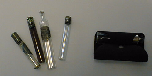 Litteä, pieni pitkulainen pullo. Hartia viisto. Kaula pyöreä, kapea. Suureuna driivattu. Kaulassa lankasidos, mahdollisesti jäänne korkin sidoksesta. Ylälaidassa pyöreä kellan ruskea liimalappu, jossa tyylitellyin , vaalein tikkukirjaimin: MUGUET, PARFUM COSTA, PARIS, NEUILLY.