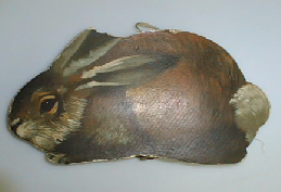 Matala rasia, jonka painettava kansi pohjaosaa leveämpi, muotoiltu ja painettu kanin kuvaksi. Rasian sisällä reunoissa paperinen pitsinauha, kannen reunoissa nauhat. Sisus rasvainen: ilmeisesti suklaarasia.