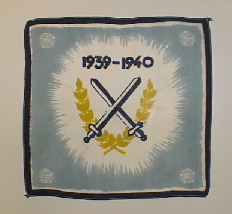 Neliön muotoinen, silkkikreppiä, väritykseltään sini-valkoinen + keltaista kuvioissa. Keskellä kuvioaihe, jossa ristikkäiset miekat taustanaan keltaiset lehdykät. Kuvion yläpuolella vuosiluvut 1939-1940. Kulmissa kukkakuviot.