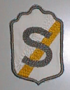 Valk. palttinaa, päärmätty hopeanharmaalla langalla. S-kirjain samalla värillä, sen alla vinoraidat ovat valkoinen ja keltainen.