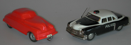 Pellistä valmistettu poliisiauto, jonka kyljet, konepellin ja peräosan päälliset ovat mustat, katto ja konepellin ja peräosan reunat valkoiset. Auto on amerikkalaistyylinen ja sen sivuilla ja perässä lukee POLICE. Lisäksi rekisterikilvessä lukee: SSS. Auton vasemmalla sivulla on anteeni ja auton katolla on peltinen, maalattu merkkivalo. Autossa on kumiset renkaat, joissa on kiiltävät peltiset pölykapselit. Autossa on vieterimekanismi, joka saa auton kulkemaan eteenpäin, kun autoa vedetään taaksepäin.