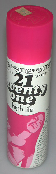 Naisen kuva Sylinterin muotoinen, irrallinen painettava korkki, suihkusuutin. Painatus: Mum 21 twenty-one high life Rekisteröity tavaramerkki Bristol-Myers Company, ym.