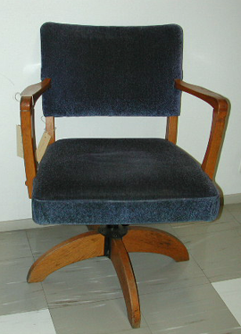 Billnäsin amerikkalaismallinen tammesta tehty konttorituoli, jossa on käsinojat. Sen istuin on pyörivä ja sen korkeutta voi säätää. Tuolin rungon muodostaa metalliakseli, jonka alapuolelle on kiinnitetty nelihaarainen tammesta tehty jalkaosa. Selkänojan ja istuinlevyn verhoiluna on sininen sametti. Tuoli on ilmeisesti verhoiltu myöhemmin, jolloin osa selkänojasta on peittynyt.