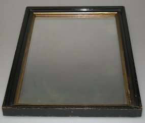 Puukehyksillä ympäröity suorakaiteen muotoinen peili, jonka yläreunassa on seosmetallista valmistettu ripustuslenkki. Kehyksisissä on koristeuria; kehysten ulkoreuna on ylinnä ja alinna sisäreuna, joka on kullattu. Keyhyksissä on jiirikulmat. Peilin tausta on päällystetty sinisellä tekonahkapäälysteisellä pahvilla. Taustan keskellä on kolmion muotoinen aukko, jossa on ollut jonkinlainen tukijalka, jonka avulla peili on saattanut seistä pöydällä.