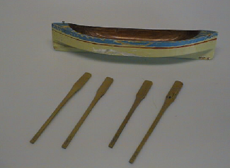 Yhdestä puusta valmistettu vene, jossa pitkä köli. Alaosa maalattu keltaiseksi, yläreuna siniseksi. Kyljessä kapea punainen raita. Kiinnityskoukku toisessa päässä.