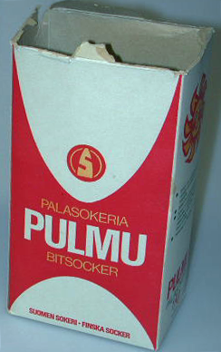 Pystyn suorakaition muotoinen laatikko, jossa punavoittoiset painatteet. Teksti: palasokeria PULMU bitsocker Suomen Sokeri Finska Socker. Kyljessä auringon kuva ja tietja sokerin tuotannosta ja käytöstä.