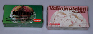 Suorakaiteenmuotoinen, vihreä-monivärinen 1/2 litran Milanö-jäätelöpakkaus. Yhden pitkän sivun sauma kuumasaumattu ja siinä repimisviillot, molemmilla lyhyillä sivuilla saumat taitettu toistensa lomaan. Kahdella vastakkaisella pitkällä päälisivulla ns. kansikuvina valokuva jäätelöstä lasisessa jälkiruokakulhossa. Päälisivuissa Pauligin logo (soikealla punaisella pohjalla logoteksti valkoisella) sekä tekstit: "Milano Pauligin kermajäätelöä. Maustettu mansikka-aromilla, vaniljalla ja kaakaolla. 1/2 litraa/Milano Pauligs gräddglass. Smaksatt med jordgubbsarom, vanilj och kakao. 1/2 liter". Kylkisivuilla kerrotaan kermajäätelön koostumus ja energiasisältö sekä säilytysohjeet, toisella sivulla suomeksi, toisella ruotsiksi.